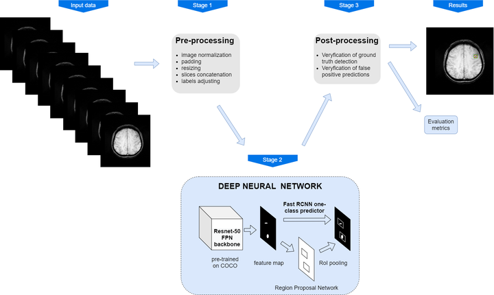 Image credit: UnsplashMachine learning-based systems are gaining interest in the field of medicine, mostly in medical imaging and diagnosis. In this paper, we address the problem of automatic cerebral microbleeds (CMB) detection in magnetic resonance images. It is challenging due to difficulty in distinguishing a true CMB from its mimics, however, if successfully solved, it would streamline the radiologists work. To deal with this complex three-dimensional problem, we propose a machine learning approach based on a 2D Faster RCNN network. We aimed to achieve a reliable system, i.e., with balanced sensitivity and precision. Therefore, we have researched and analysed, among others, impact of the way the training data are provided to the system, their pre-processing, the choice of model and its structure, and also the ways of regularisation. Furthermore, we also carefully analysed the network predictions and proposed an algorithm for its post-processing. The proposed approach enabled for obtaining high precision (89.74%), sensitivity (92.62%), and F1 score (90.84%). The paper presents the main challenges connected with automatic cerebral microbleeds detection, its deep analysis and developed system. The conducted research may significantly contribute to automatic medical diagnosis.
